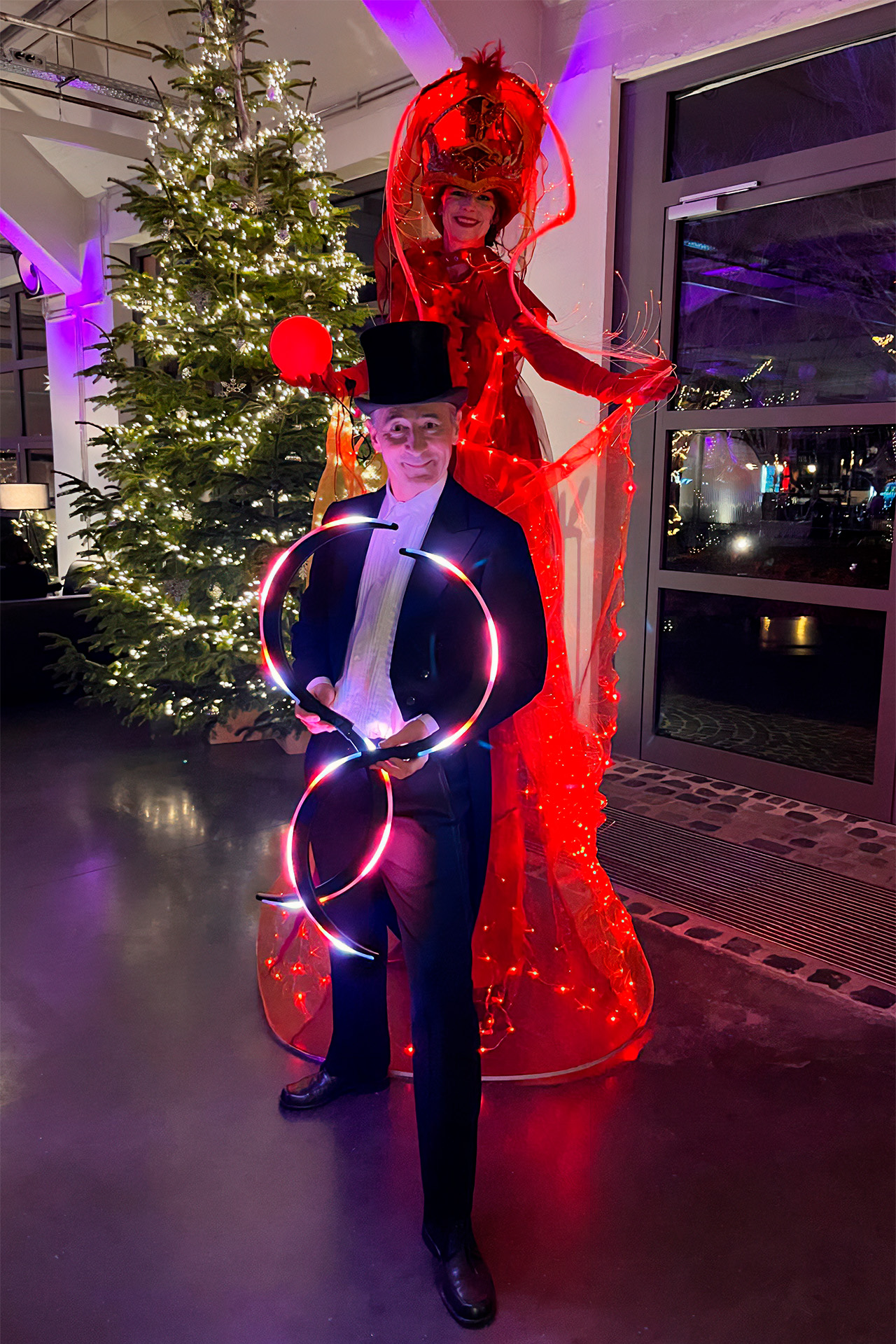 Die Gäste wurden stilvoll von einer kunstvoll kostümierten Stelzenläuferin begrüßt, bevor sie die Show aus DJ-Set und Live-Musik des Kölner Duos „Drei Liköre“ erwartete. Eine LED-Lichtshow sorgte im Innenraum für faszinierende Effekte, während um Mitternacht eine spektakuläre Feuer- und Lichtshow unter freiem Himmel für Gänsehaut sorgte.