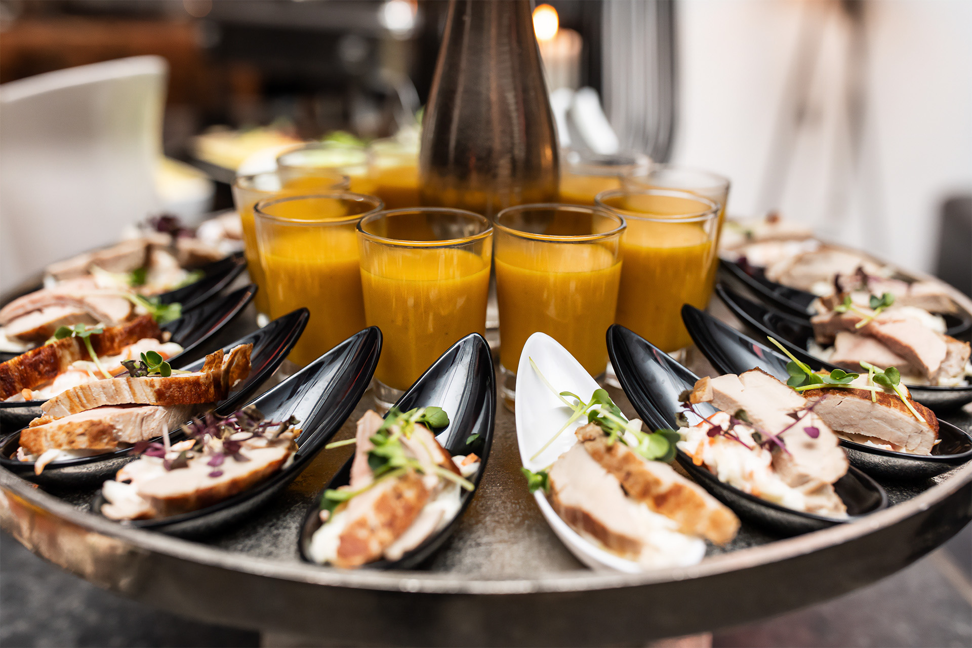 Für das leibliche Wohl arbeiten wir mit ausgewählten Catering-Partnern zusammen, die wir persönlich kennen und denen wir seit Jahren vertrauen. Diese Partner verstehen es, kulinarische Konzepte individuell auf Ihre Veranstaltung abzustimmen – ob festliches Menü, lockeres Buffet oder Fingerfood. Die Getränkeauswahl wird nach Ihren Wünschen zusammengestellt und vollständig von uns organisiert. Vom Aperitif bis zum Mitternachtsdrink stellen wir sicher, dass alles perfekt auf Ihr Event abgestimmt ist. So entsteht ein rundum stimmiges Erlebnis – mit Service aus einer Hand.